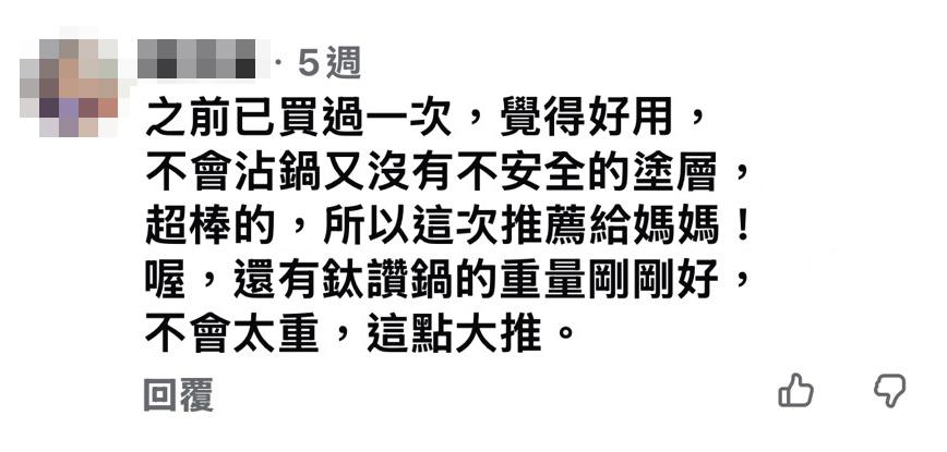 之前已買過一次,覺得好用, 不會沾鍋又沒有不安全的塗層,超棒的,所以這次推薦給媽媽! 喔,還有鈦讚鍋的重量剛剛好, 不會太重,這點大推。