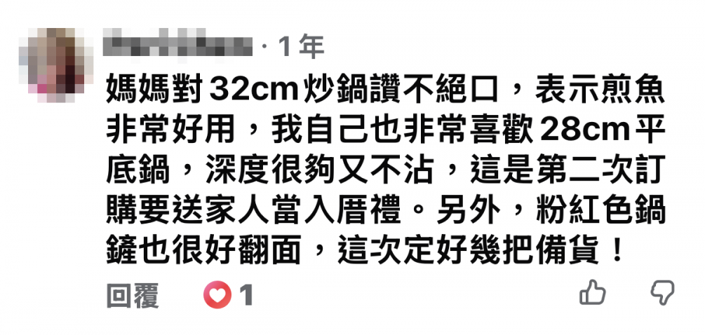 媽媽對32cm炒鍋讚不絕口,表示煎魚非常好用,我自己也非常喜歡28cm平底鍋,深度很夠又不沾,這是第二次訂購要送家人當入厝禮。另外,粉紅色鍋鏟也很好翻面,這次訂好幾把備貨!