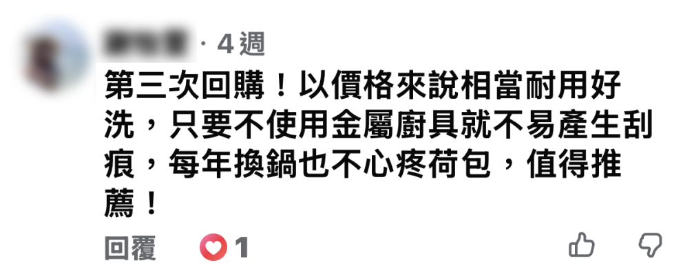 第三次回購!以價格來說相當耐用好洗,只要不使用金屬廚具就不易產生刮痕,每年換鍋也不心疼荷包,值得推薦!