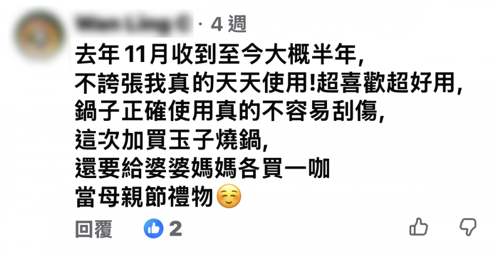 去年11月收到至今大概半年,不誇張,我真的天天使用!超喜歡超好用,鍋子正確使用真的不容易刮傷,這次加買玉子燒鍋,還要給婆婆媽媽各買一咖