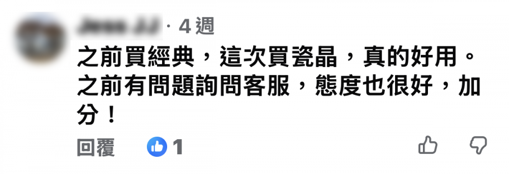之前買經典,這次買是瓷晶,真的好用。之前有問題詢問客服,態度也很好,加分!