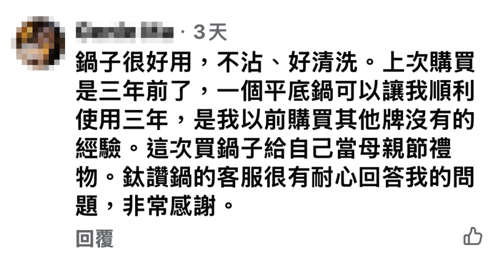鍋子很好用,不沾、好清洗。上次購買是三年前了,一個平底鍋可以讓我順利使用三年,是我以前購買其他牌沒有的經驗。這次買鍋子給自己當母親節禮物。鈦讚鍋的客服很有耐心回答我的問題,非常感謝。